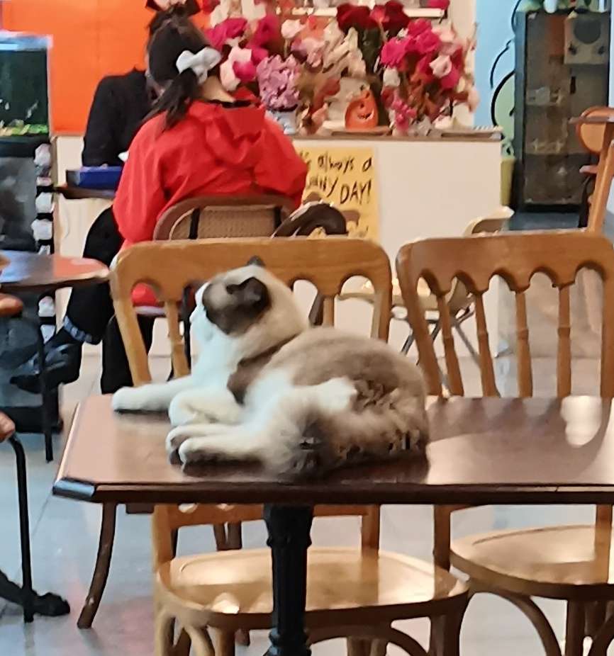 奇!甜品店里面一对情侣正聊着,外面桌子上却有宠物猫尾巴竖来竖..